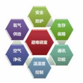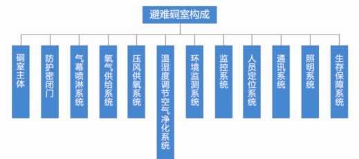 避難硐室設(shè)置在式煤礦井下適當(dāng)位置,配備有維持人員生存所需的相關(guān)設(shè)備設(shè)施和食物、水等,為保證煤礦災(zāi)害發(fā)生時(shí),給無(wú)法撤離災(zāi)區(qū)的遇險(xiǎn)人員提供生命保障的空間。避難硐室與礦井安全監(jiān)測(cè)監(jiān)控、人員定位、壓風(fēng)自救、供水施救、通信聯(lián)絡(luò)等系統(tǒng)相連,形成井下整體性的安全避難系統(tǒng),主要由防爆密閉系統(tǒng)、氧氣供給系統(tǒng)、通訊及人員定位系統(tǒng)、監(jiān)測(cè)監(jiān)控系統(tǒng)、環(huán)境控制系統(tǒng)、照明系統(tǒng)、生存保障系統(tǒng)組成。